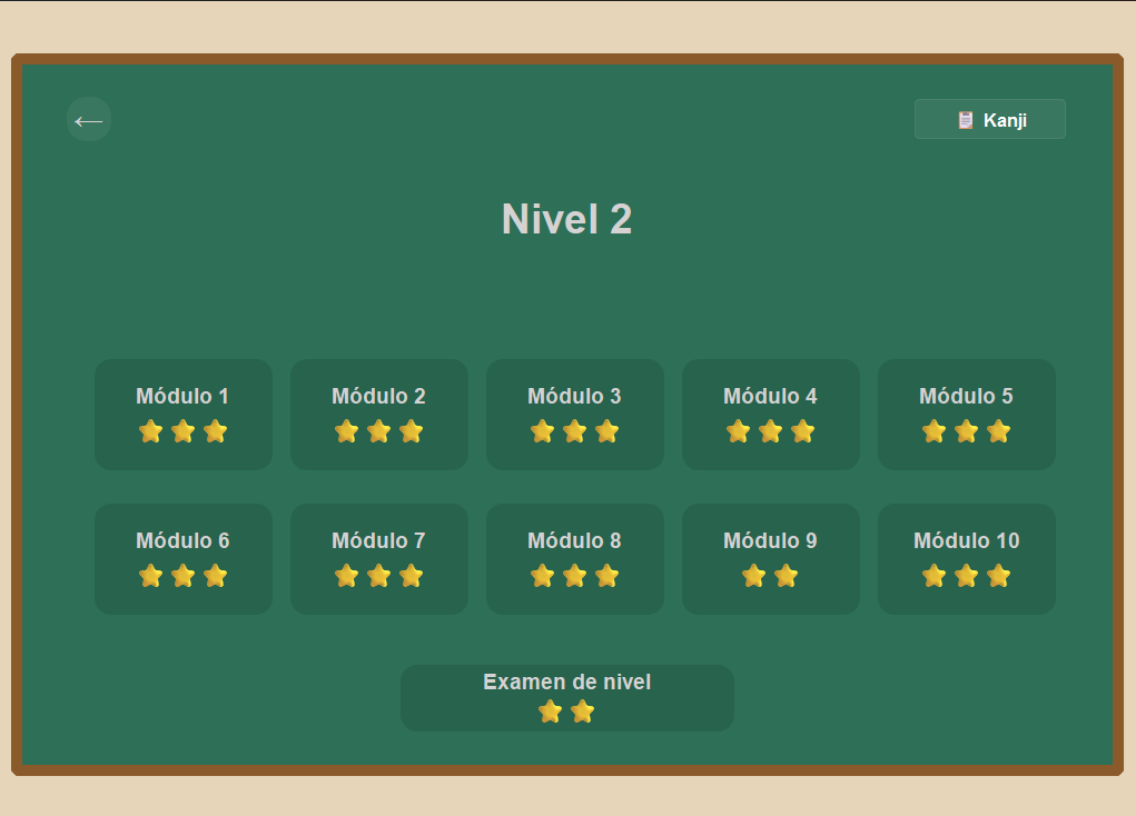 Los kanji están organizados por nivel y módulo, siguiendo una secuencia lógica donde cada carácter se construye a partir de elementos ya conocidos.